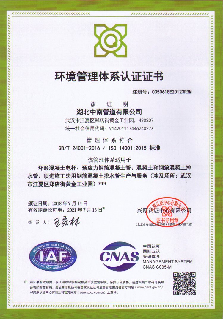 湖北中南管道有限公司始建于1952年,原屬?lài)?guó)家建材部直屬企業(yè),是國(guó)家三大水泥制品骨干企業(yè)之一。曾為************座長(zhǎng)江大橋——武漢長(zhǎng)江大橋生產(chǎn)特制大橋桿;為馬耳他等國(guó)援建多座水泥制品廠(chǎng);首創(chuàng)的國(guó)內(nèi)環(huán)形力混凝土電桿和三階段混凝土壓力管榮獲1978年全國(guó)科技大會(huì)科研成果獎(jiǎng)及優(yōu)秀產(chǎn)品獎(jiǎng)。公司現(xiàn)有資產(chǎn)規(guī)模億元,擁有25項(xiàng)實(shí)用新型專(zhuān)利、3項(xiàng)發(fā)明專(zhuān)利,是國(guó)家大力支持和發(fā)展的高新技術(shù)企業(yè)。主要生產(chǎn)環(huán)形混凝土電桿、預(yù)應(yīng)力鋼筒混凝土管、鋼筋混凝土排水管、頂進(jìn)施工法用鋼筒混凝土管、預(yù)制混凝土箱涵、鋼筋混凝土異形管等產(chǎn)品,是《環(huán)形混凝土電桿》、《預(yù)應(yīng)力鋼筒混凝土管》、《混凝土和鋼筋混凝土排水管》、《預(yù)制混凝土箱涵》、《異形鋼筋混凝土異形管》、《混凝土和鋼筋混凝土排水管試驗(yàn)方法》、《管廊工程用預(yù)制混凝土制品試驗(yàn)方法》等國(guó)家標(biāo)準(zhǔn)的參編單位,目前擔(dān)任全國(guó)混凝土與水泥制品協(xié)會(huì)常務(wù)理事單位、湖北省混凝土與水泥制品協(xié)會(huì)會(huì)長(zhǎng)單位。